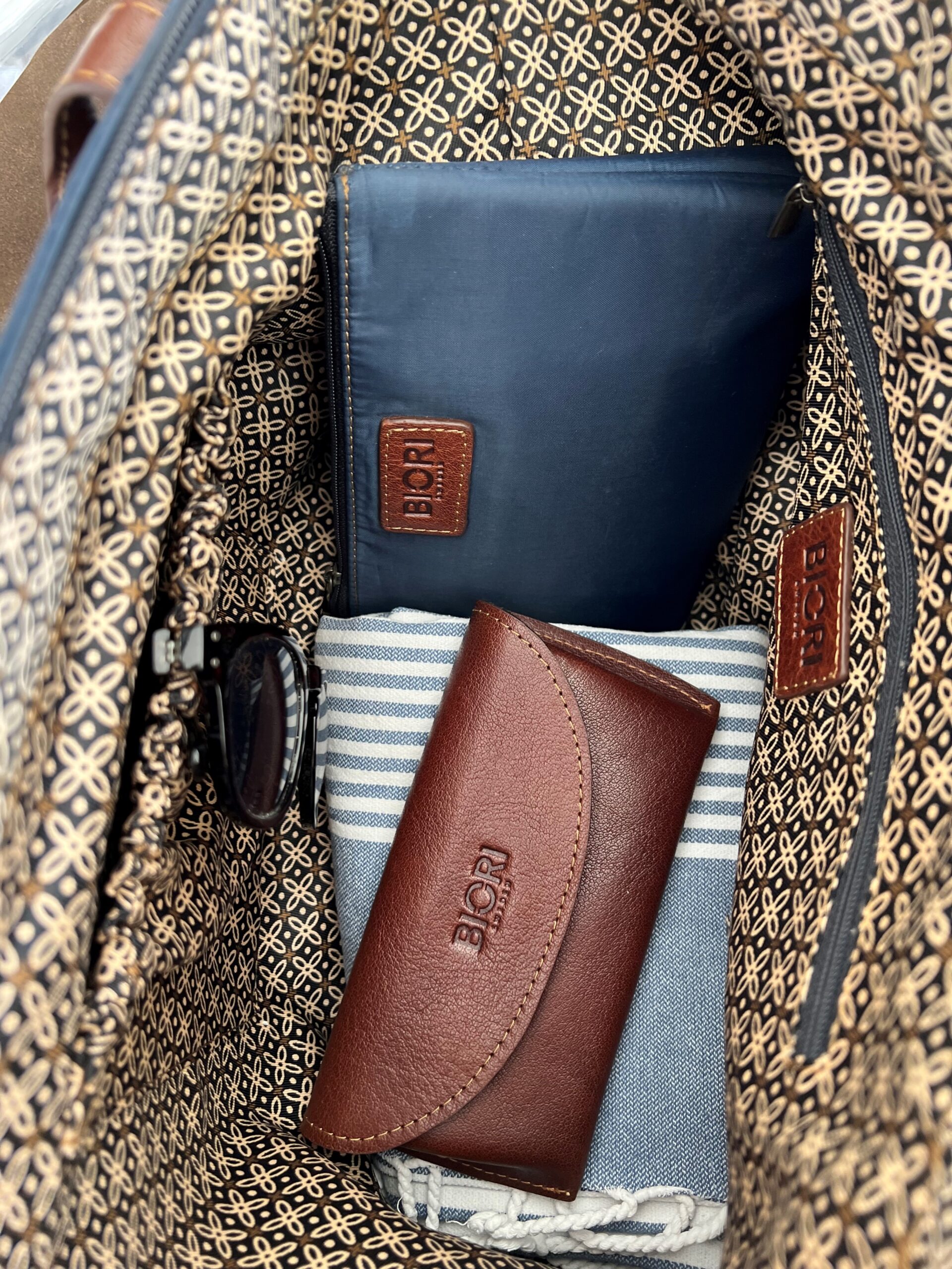Tote bag Biori 5138-N. Klassisk tote bag i ett snyggt, funktionellt och lättskött nylon material i marinblått. Bärhandtagen är i brunt läder. Bärhandtagen är tillräckligt långa för att kunna bära väskan på axeln. Handväskan stängs med en dragkedja i toppen. Inuti axelväskan finns en innerficka med dragkedja för privata ting. Inuti finns även en elastisk ficka för exempelvis mobil och laddare. Denna tote bag är ett måste för alla shoppingtillfällen och har självklart vårt snygga mönstrade BIORI foder på insidan. Matcha med våra snygga sminkväskor och eller necessärer. Man kan också använda tote bagen på resan. Eftersom den är lätt, den väger ca 450gr påverkar den vikten i resväskan väldigt lite. Använd den sedan som shoppingkasse på resmålet. Matcha med sminkväskor liten Sminkväska Biori 5136-N eller stor Sminkväska Biori 5137-N