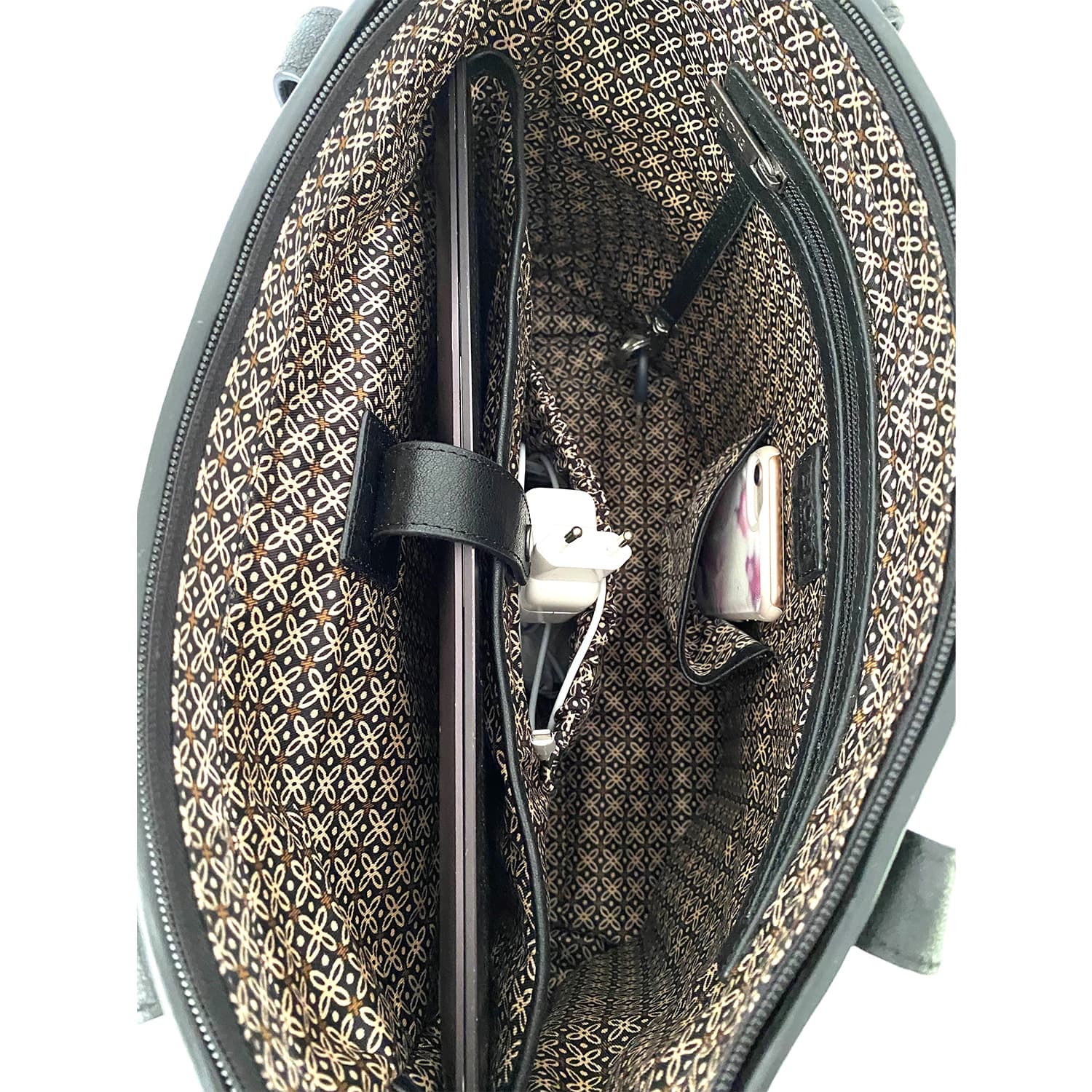 Toteväska dam har långa bärhandtag så man kan bära denna axelväska på axeln. I toppen finns en dragkedja och på baksidan finns en ficka med dragkedja för exempelvis busskort mm. Tote bagen är rymlig och har smart förvaring med plats för 14 tum laptop i den vadderade datorfickan. Inuti väskan finns också en ficka för mobilen, en nyckelringshållare, en elastisk ficka för ex. laddare. Väskan har dessutom en innerficka med dragkedja för privata ting. Under datorväska dam skinn finns små metallfötter som skyddar datorn när man exempelvis åker spårvagn eller buss. Väskan finns även i brunt Tote bag i skinn BIORI 5104-B